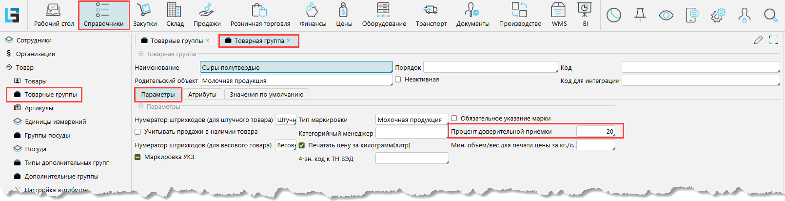 Чтобы использовать доверительную приемку, нужно установить для товарной группы или отдельного товара процент доверительной приемки. Если для группы и товара из этой группы установлено разное значение, то приоритет будет иметь значение, установленное на уровне товара.