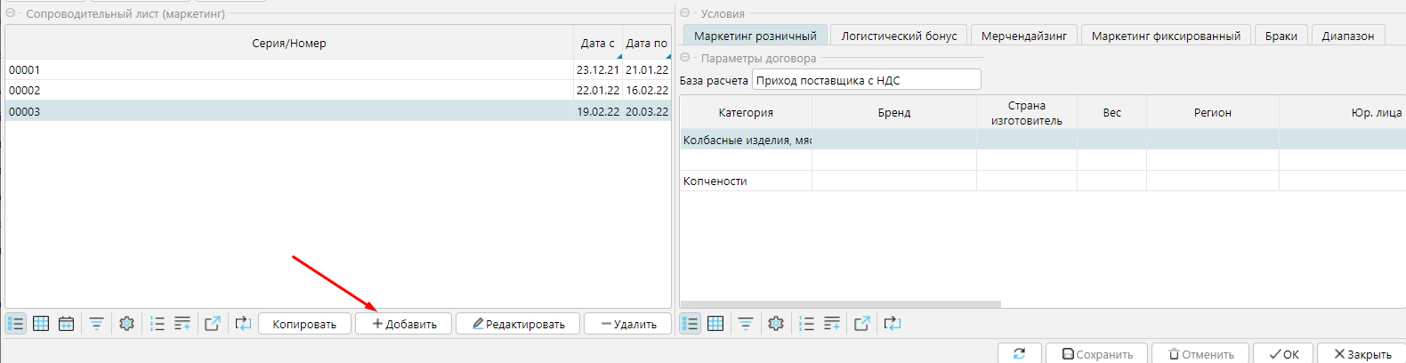 Для одного сопроводительного листа можно одновременно задавать условия маркетинга разных типов (например, одновременно Маркетинг розничный, Логистический бонус и Маркетинг фиксированный). При этом для каждого типа маркетинга может быть введено несколько разных условий.