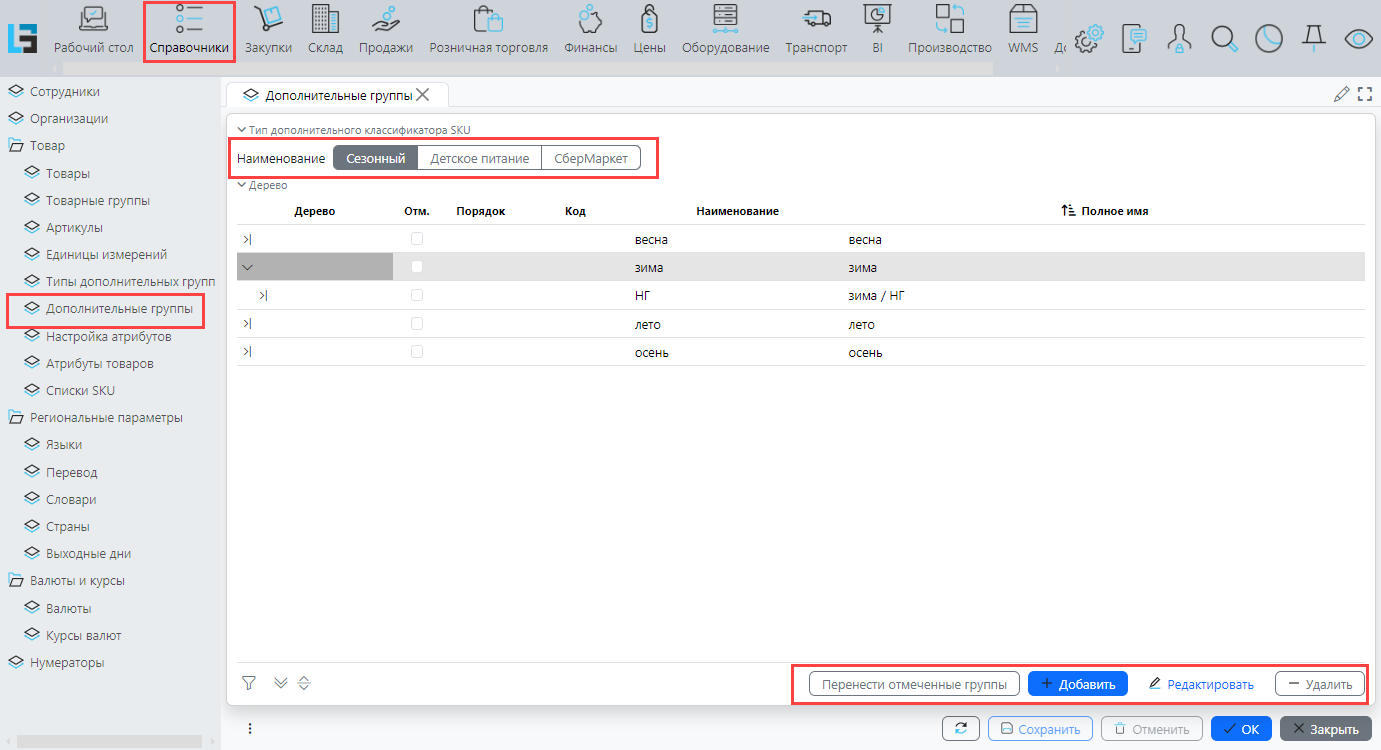 На форме **Справочники - Товары - Дополнительные группы **создается перечень подгрупп для каждого из дополнительных классификаторов. Для этого в поле Наименование указывается вид дополнительного справочника и с помощью кнопок Добавить, Редактировать, Удалить формируются список подгрупп. Количество уровней (вложенность) не ограничено. Для многоуровневого классификатора удобно пользоваться кнопкой Перенести отмеченные группы - отмеченные группы будут являться подгруппами другой родительской группы (выбирается из списка).