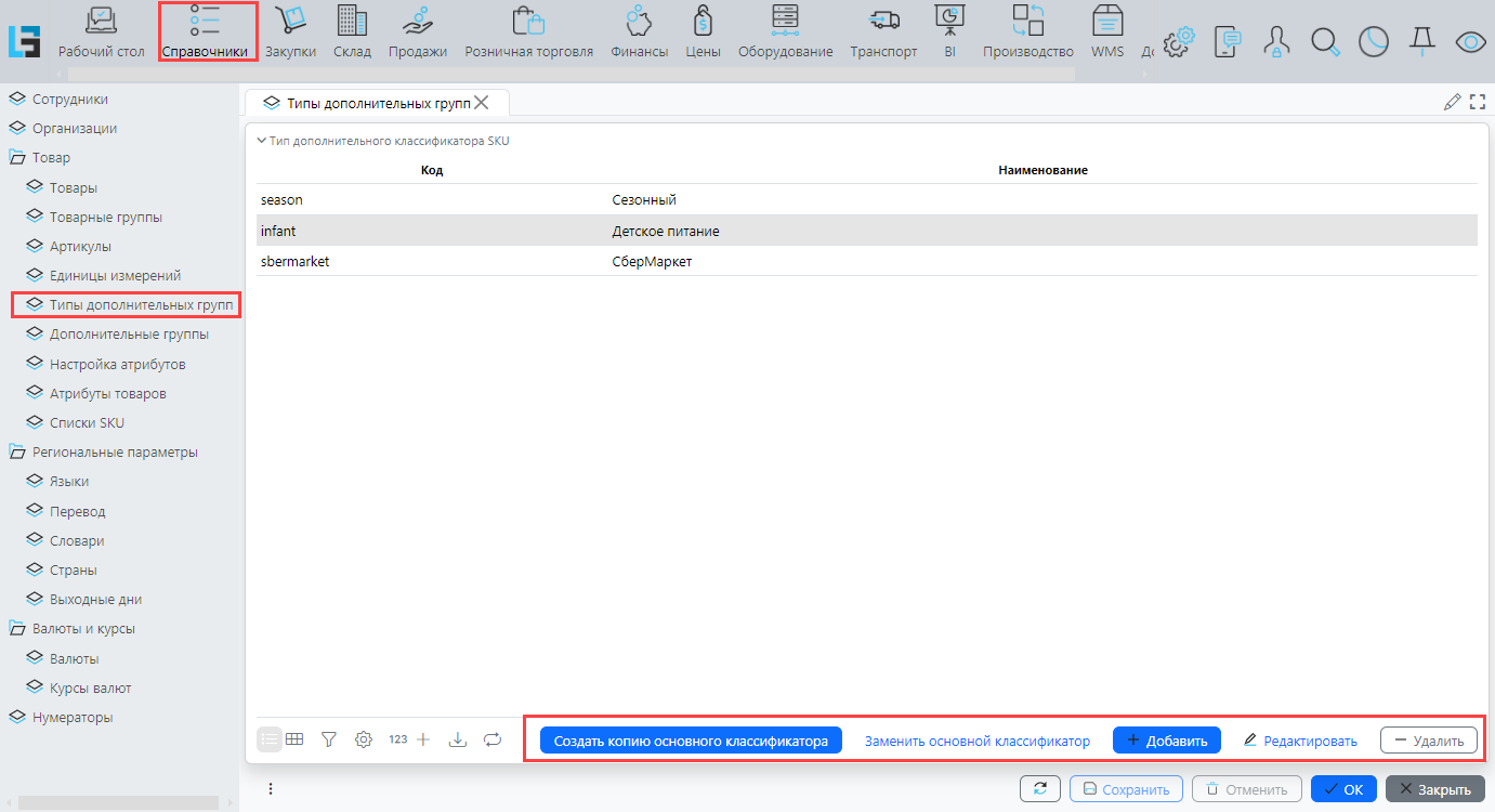 Помимо основного товарного классификатора, в программе можно поддерживать и дополнительные группы товаров. На форме Справочники - Товары - Типы дополнительных групп объявляются виды дополнительных групп. С помощью кнопки Создать копию основного классификатора добавляется новый дополнительный классификатор аналогичный основному. При этом иерархия основного справочника групп не копируется - только группы самого нижнего уровня. По кнопке Заменить основной классификатор происходит замещение основного справочника товарных групп дополнительным классификатором, на котором установлен курсор.