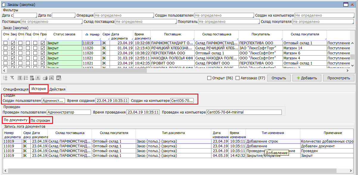 Кроме данного журнала, информацию об изменении конкретного документа и его строк можно найти на вкладке «История», на форме, где отображается документы определенного типа, например, форма «Заказы (закупка)» (рис.2.).