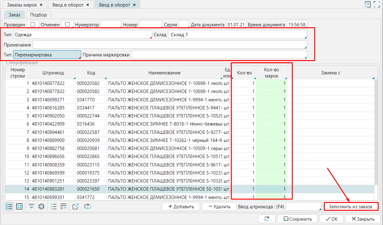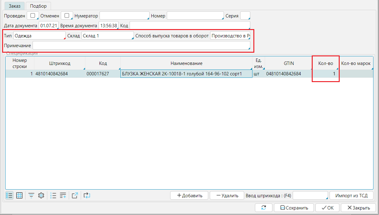 В заказе необходимо заполнить атрибуты, в спецификацию внести товары и указать количество единиц товара, которым требуются маркировка, затем Сохранить.