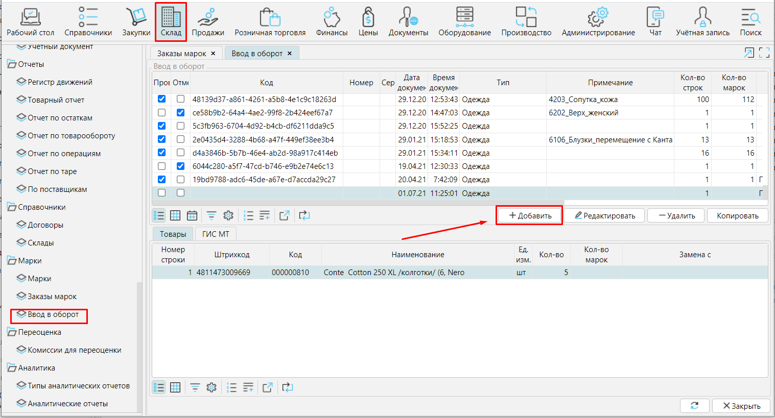 2.  СкладМаркиВвод в оборот создать новый документ кнопкой Добавить.