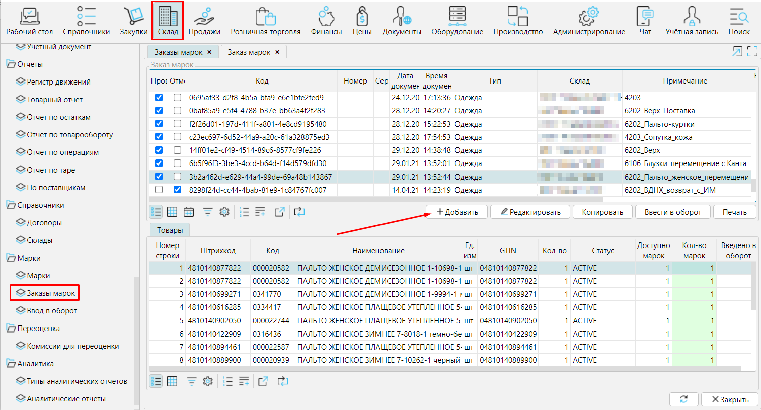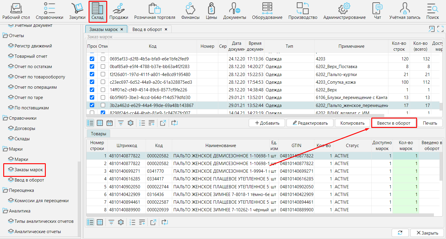 1. На форме СкладМаркиЗаказы марок нажать **Ввести в оборот