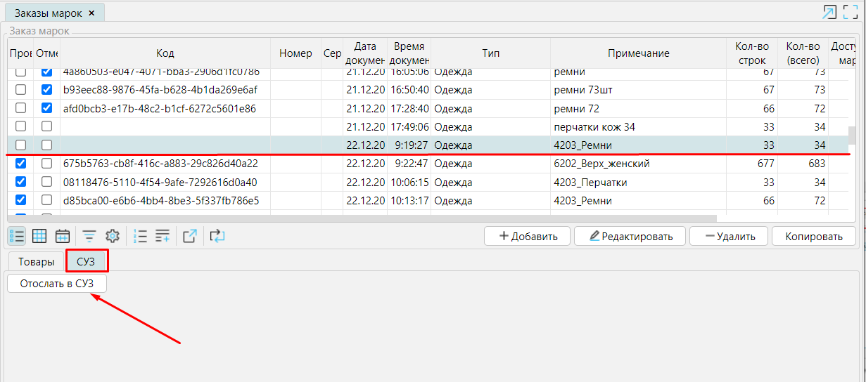 После сохранения заказа его необходимо выделить курсором на форме Заказы марок, перейти на вкладку СУЗ и нажать Отправить в СУЗ (рис. 7). При успешном выполнении запроса товарам будут выданы КМ, в заказе отобразится число выданных КМ.