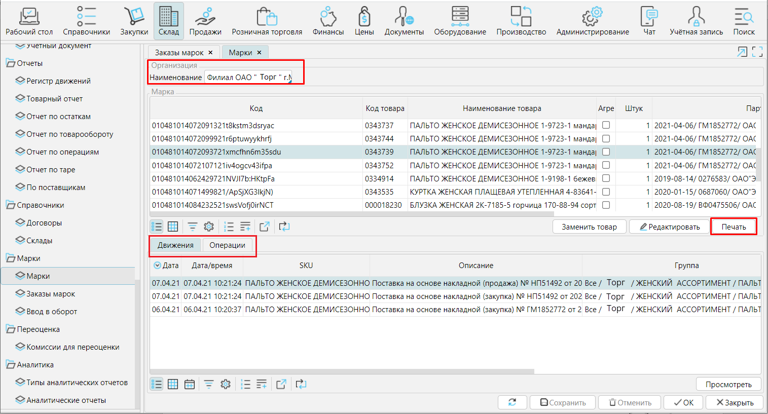 На форме СкладМаркиМарки отображаются все КМ, имеющиеся в системе, в разрезе организации. С данной формы можно напечатать вновь полученные КМ для физической маркировки товара. По КМ, выделенной курсором, отображаются все документы, фиксирующие перемещения КМ.