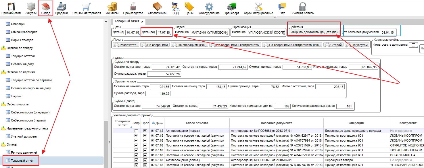 Для этого, на форме товарный отчет необходимо нажать кнопку Закрыть документы до Дата(по).