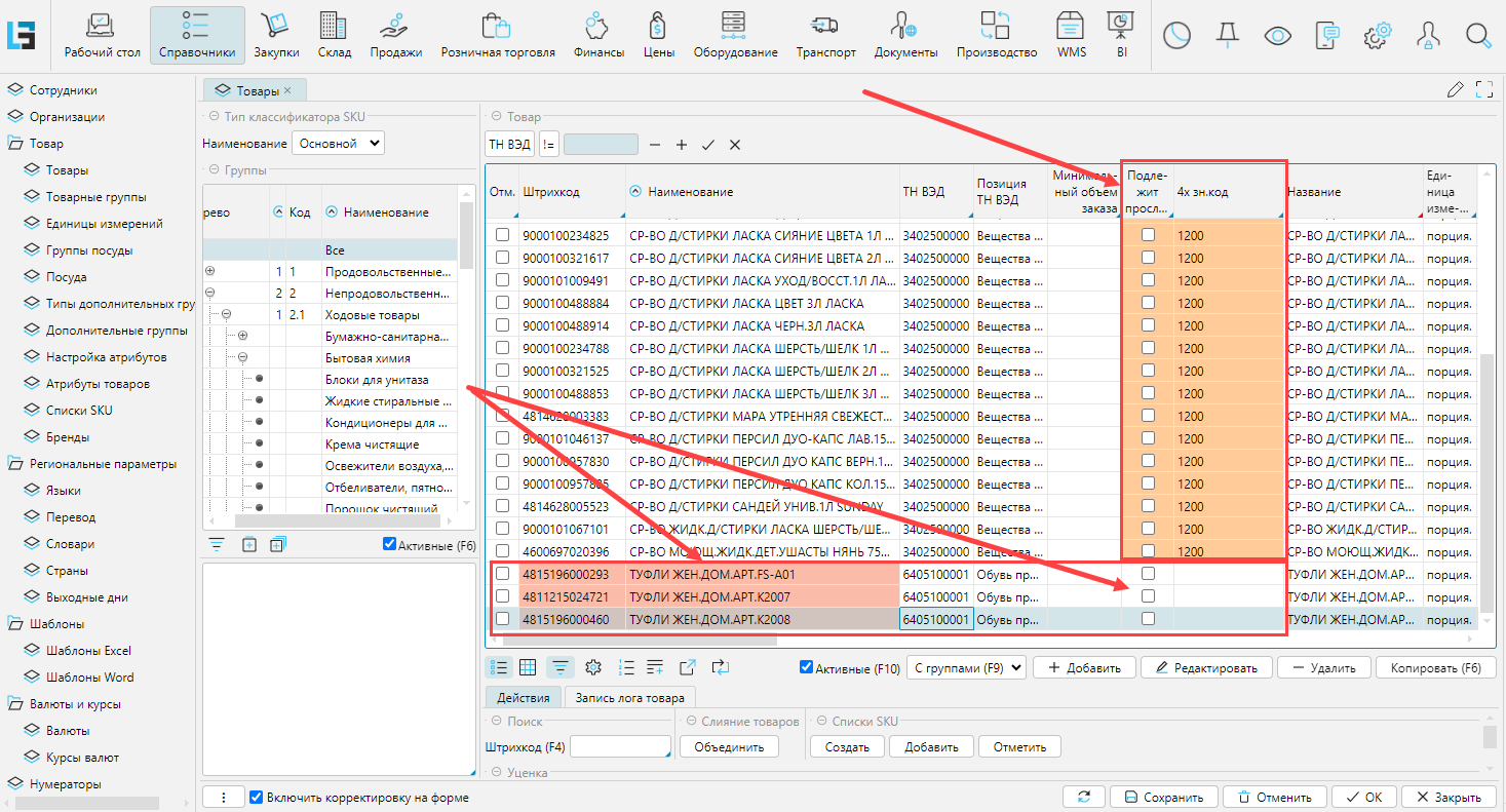 - у товаров, для которых назначены 4-значные коды, в справочнике, в карточке товара и в документах светло-оранжевым цветом подсвечивается 4-значный код и признак прослеживаемости.