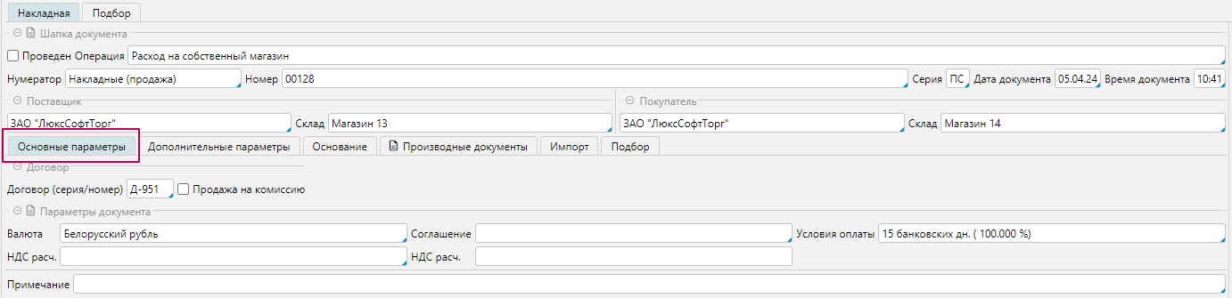 • Остальные параметры документа заполняем в зависимости от операции: Соглашение, Условия оплаты, Продажа на комиссию и другие доступные в этом блоке