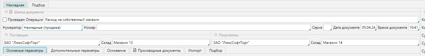 • Номер и серия накладной назначаться автоматически при сохранении документа(при настроенном нумераторе), есть возможность вручную указать номер и серию