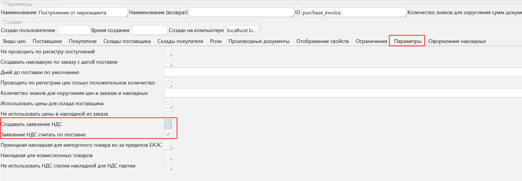 2.  В настройках операции закупки, по которым формируется заявление НДС на вкладке Параметры надо отметить признак Создавать заявление НДС, Тогда в накладной с этой операцией будет доступна вкладка Заявление НДС