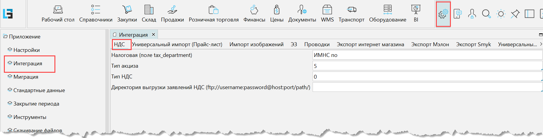 1. На форме Администрирование - **Интеграция ** вкладка НДС указать данные: указать отделение ИМНС, куда направляется заявление, тип акциза и НДС, а также директорию выгрузки заявлений.