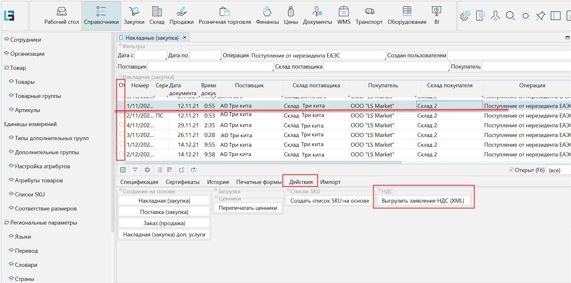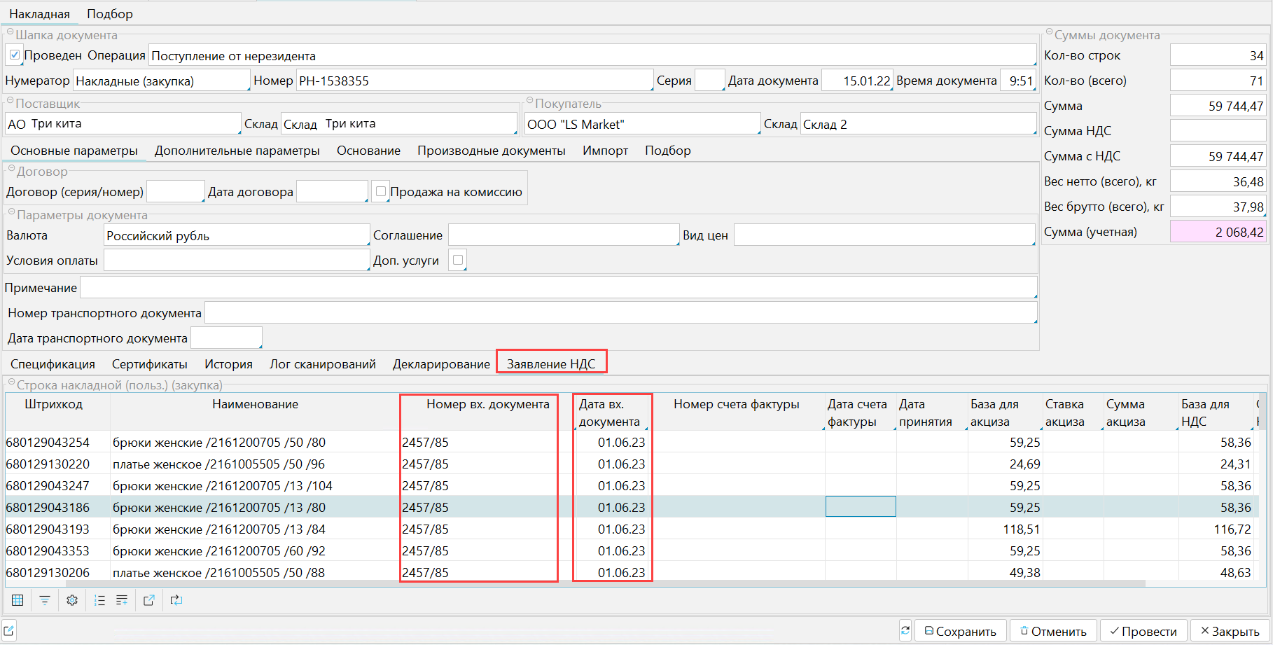 Также доступна опция Заявление НДС считать по поставке - в заявление НДС будет указано фактически поступившее количество товара. Если признак не отмечен используется количество накладной.