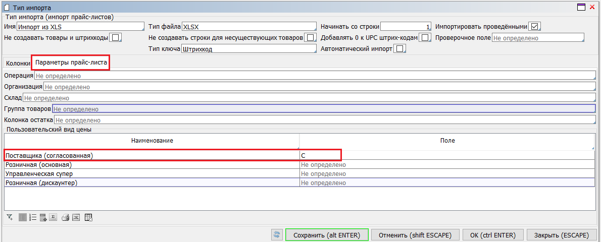 После ввода нового свойства, ему также присваивается поле  из файла импорта. На вкладке "Параметры прайс-листа" для импортируемой цены указывается соответствующая колонка в файле импорта. Здесь же можно внести и некоторые параметры для шапки прайса, которые будут подставляться в момент импорта: