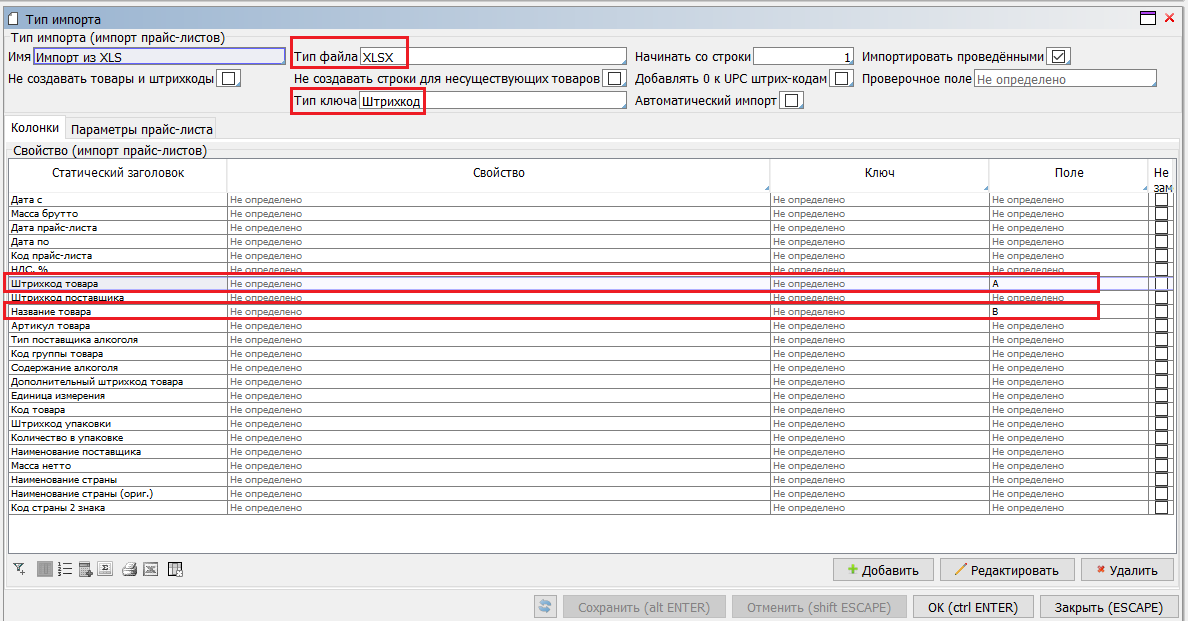 На форме Тип импорта указывается имя импорта, тип импортируемого файла, а также поле, которое будет являться идентификатором уникальности данных в файле - поле "Тип первичного ключа". Обычно это Штрихкод или Код товара. Для каждого типа импорта предусмотрен типовой набор описательных свойств - вкладка "Колонки". Для свойств, имеющихся в файле, необходимо указать соответствие со свойствами из доступного списка: в колонке "Поле" указывается имя колонки из внешнего файла. С помощью отметки "Не замещать" можно установить запрет на изменение этого свойства в базе данных.