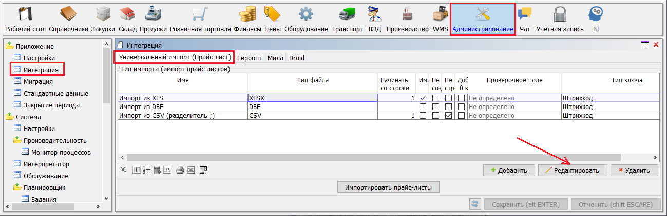 На форме Администрирование\Приложение\Интеграция можно настроить импорт прайс-листов из внешнего файла - вкладка "Универсальный импорт (Прайс-лист)". Поддерживаются форматы: XLS, XLSX, DBF и CSV.