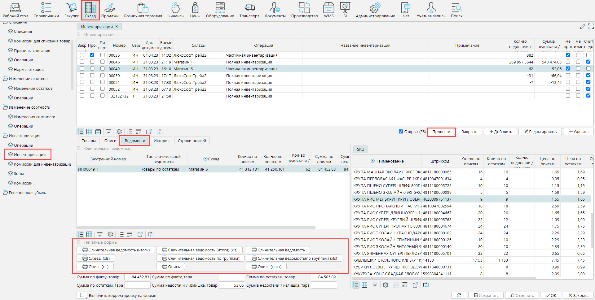 В отличие от большинства документов, кнопка Провести для инвентаризации находится не в документе, а на форме Склад - Инвентаризации.