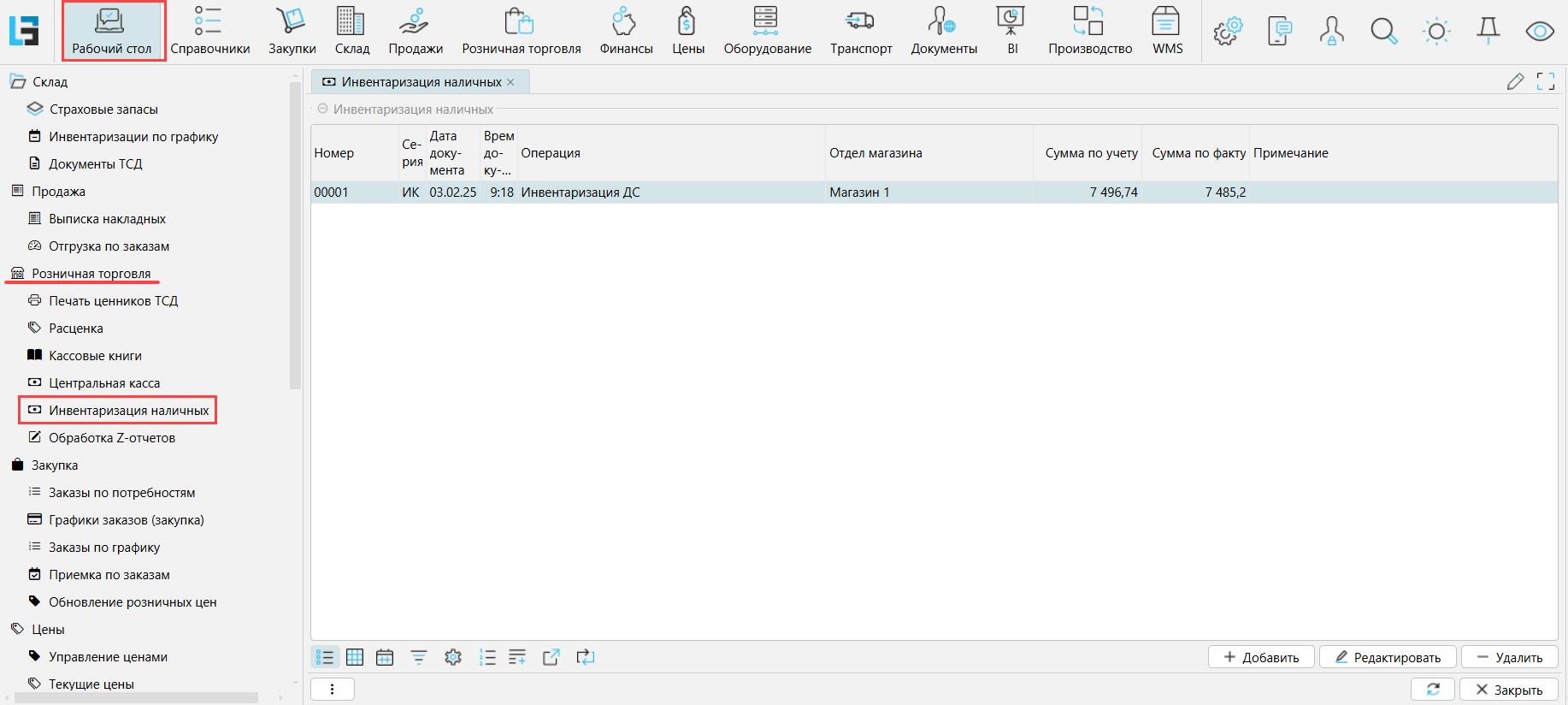 На форме Рабочий стол - Розничная торговля - Инвентаризация наличных отображаются все документы инвентаризации наличных в центральной кассе.