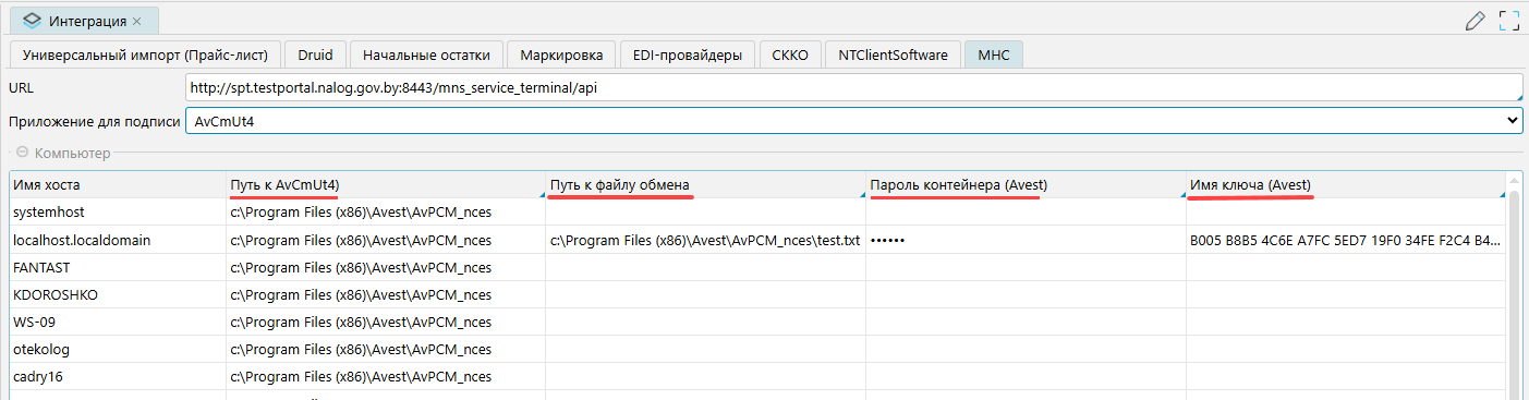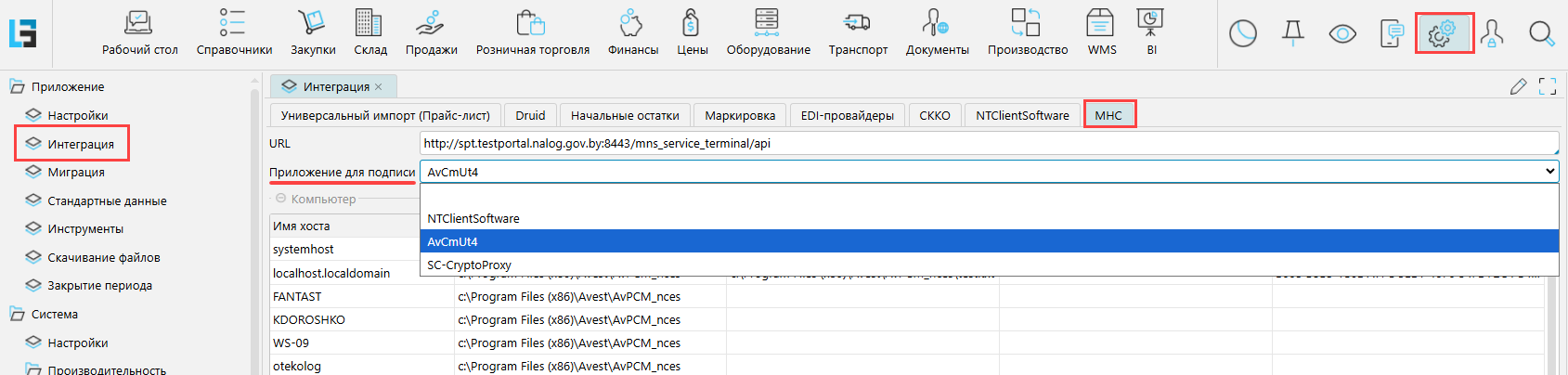 1. На форме Администрирование - Интеграция вкладка МНС указать путь подключения к СПТ и выбрать приложение для подписи.На дату статьи пути были:для тестового http://spt.testportal.nalog.gov.by:8443/mns\_service\_terminal/apiдля продуктива https://portal.nalog.gov.by:8443/mns\_service\_terminal/apiАктуальную информацию уточняйте у МНС.