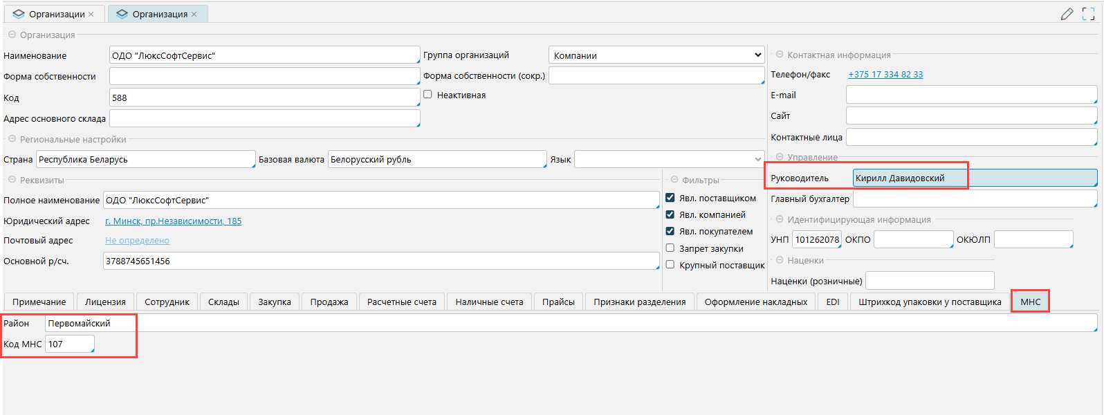 2. В карточке организации (компании), которая работает с прослеживаемыми товарами, кроме основных реквизитов и идентификаторов необходимо на вкладке МНС указать Район и Код инспекции по налогам и сборам, к которой относится организация. Данные по кодам ИМНС можно узнать на сайте Министерства по налогам и сборам (https://nalog.gov.by/inspectorates/). Также нужно указать Руководителя организации, от имени которого подписываются документы для налоговой.