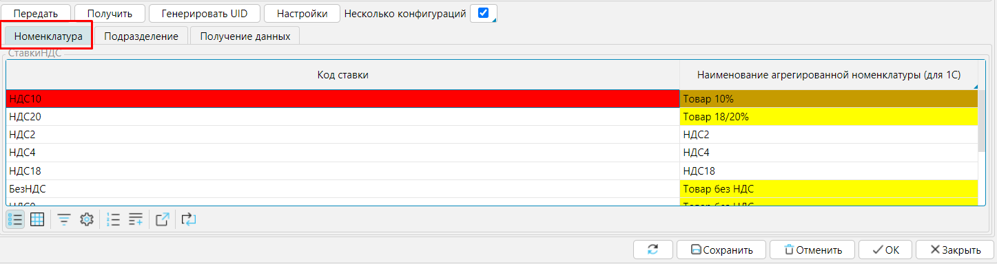 Настройки на вкладках Номенклатура, Подразделение и Получение данных применяются ко всем конфигурациям