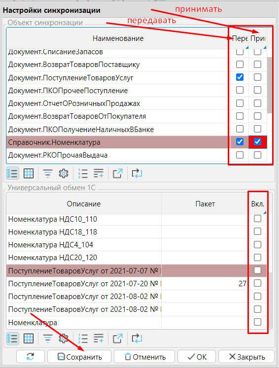 Настройки - кнопка открывает окно настроек данных и направления обмена. В верхней части окна необходимо указать направление обмена Передавать и/или Принимать для тех документов и справочников, которые должны принимать участие в обмене. В нижней части окна можно включить или исключить из обмена конкретный документ или элемент справочника. Настраивается для каждой конфигурации индивидуально. На основании настроек верхней части автоматически формируется пакет настроек обмена для тех конфигураций 1С, которые его требуют при первоначальной настройке (например УТ).