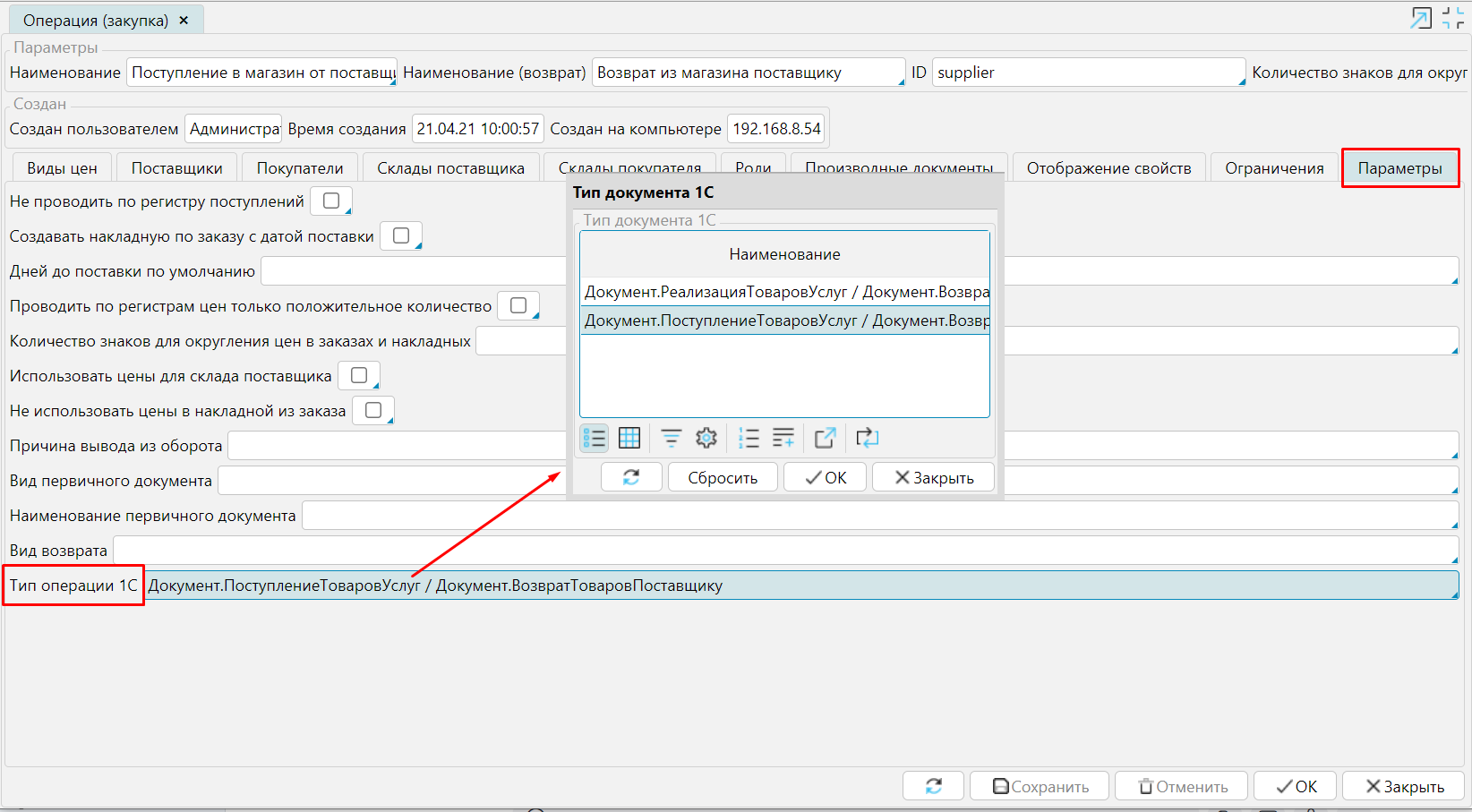 На вкладке Параметры в поле Тип операции 1С необходимо выбрать тип соответствующего документа в 1 С.