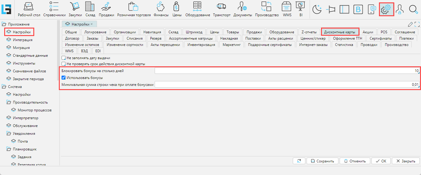 Для активации бонусной программы в Администрирование - Настройки - Дисконтные карты необходимо: