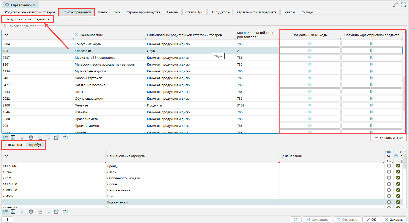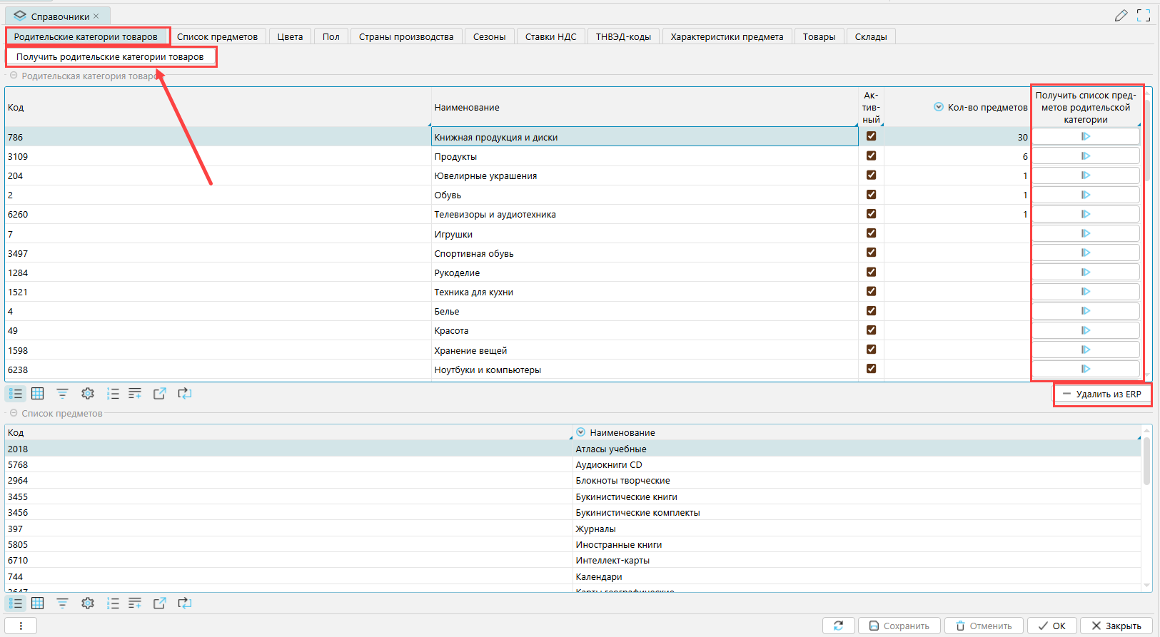 Получить список предметов - по кнопке загружается список предметов (дочерних категорий) всех загруженных родительских категорий. По тем родительским категориям, которые не загружены или удалены из системы lsFusion ERP, предметы не загрузятся.
