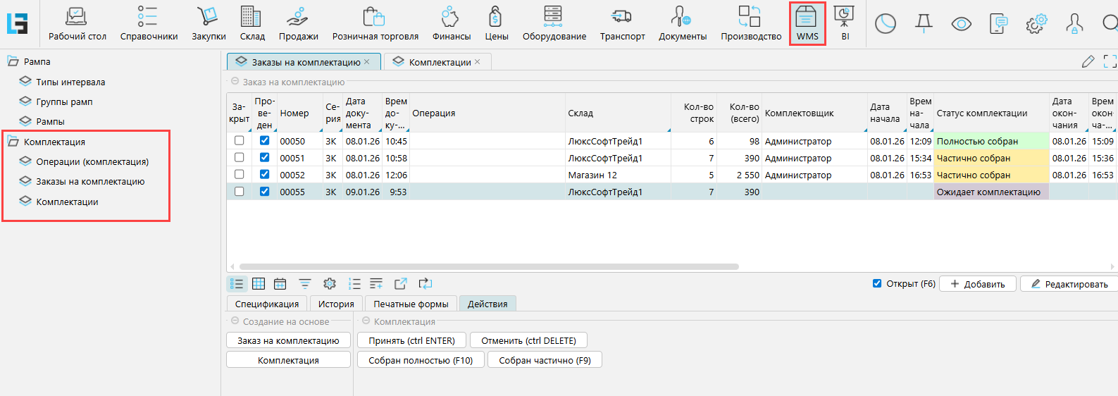 Документы заказы на комплектацию и комплектации доступны на соответствующих формах в меню WMS - Комплектация. На формах Заказы на комплектацию и Комплектации можно просмотреть и создать необходимые документы, а также выполнить полный цикл комплектации заказа. Однако эти формы используются в основном для настройки и отладки процесса, а реальные рабочие процессы сборщики выполняют на форме Рабочий стол - Продажа - Комплектация.