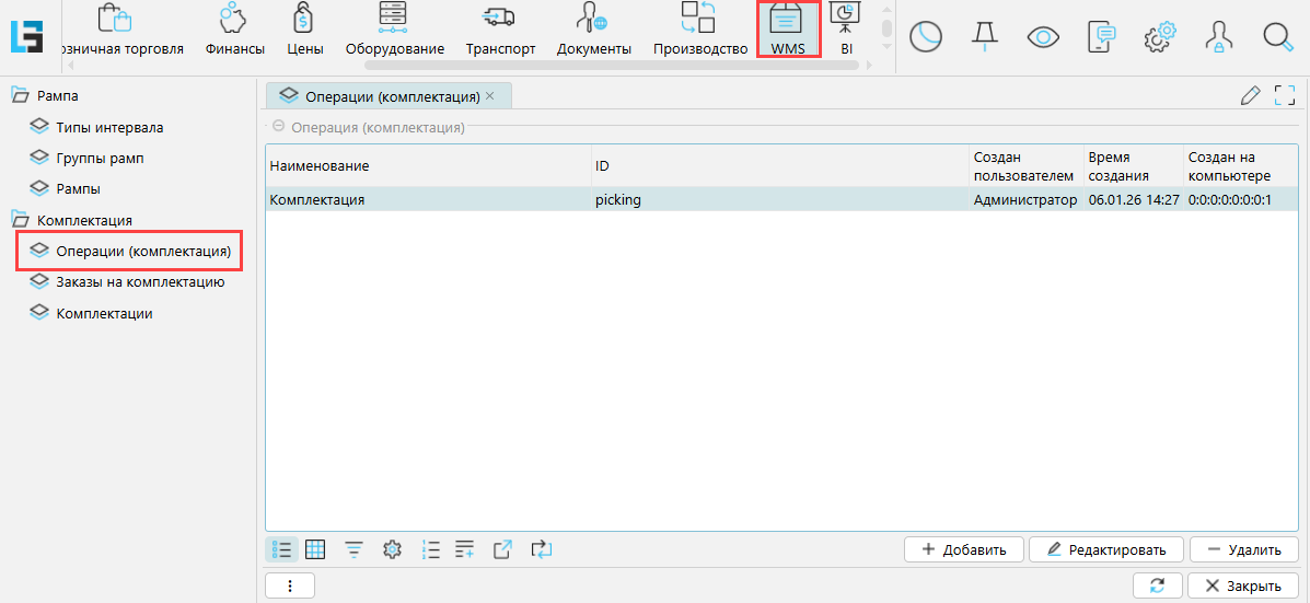 Для комплектации заказов необходимо настроить операцию комплектации на форме WMS - Комплектация - Операции (комплектация).