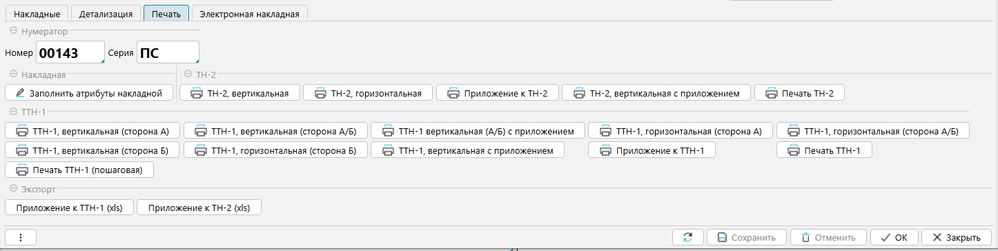 На вкладке Печать нужно Заполнить атрибуты накладной и вывести на печать подходящую форму сопроводительных документов. Как это делать подробно описано в этой статье.