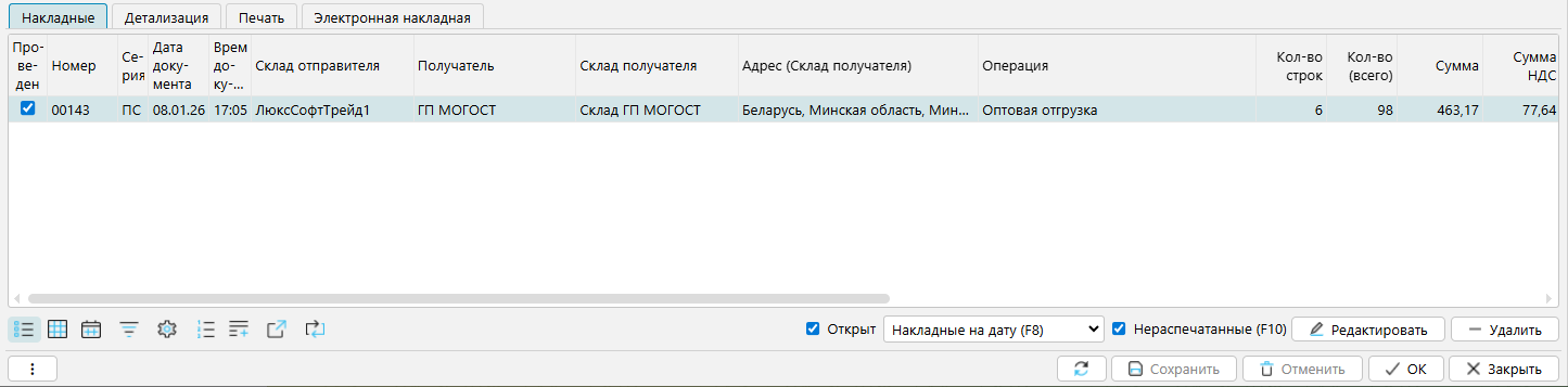 Все созданные накладные отображаются на вкладке Накладные, где по кнопке Редактировать можно открыть форму накладной для внесения необходимых изменений.