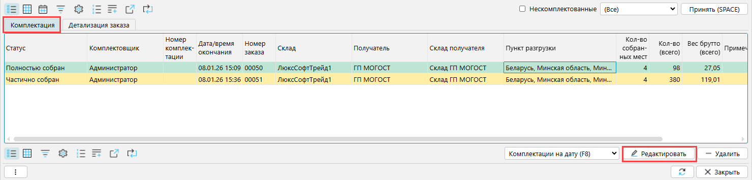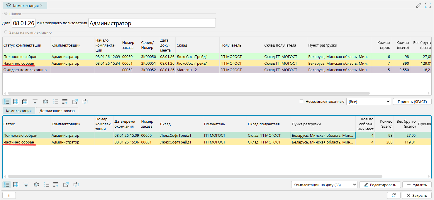 Откорректированная комплектация отобразится на вкладке Комплектация. Заказ и комплектация перейдут в статус Частично собран.