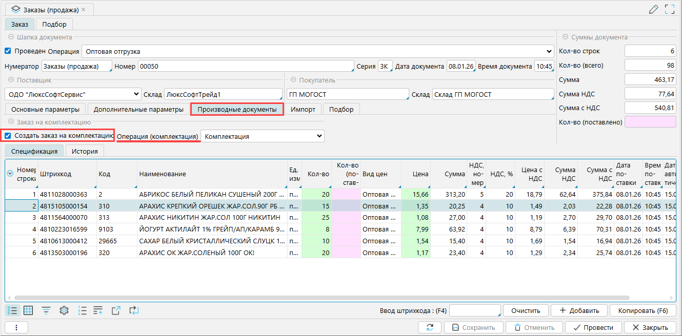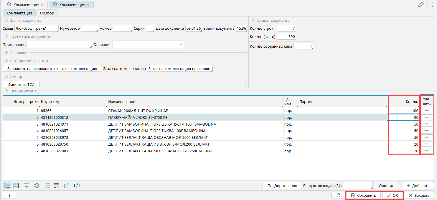 Будет создана комплектация. Форма комплектации откроется для редактирования. На форме будут заполнены товарные строки в соответствии с данными заказа на комплектацию. Комплектовщик должен внести фактическое количество собранных товаров в колонке Кол-во и при необходимости скорректировать перечень собранных товаров. Затем нажать ОК или Сохранить.