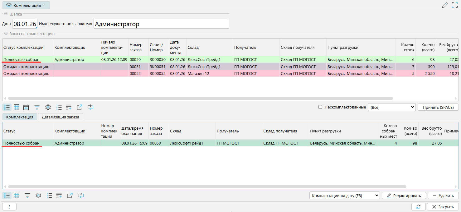 Будет создана комплектация, которая отобразится на вкладке Комплектация. Заказ и комплектация перейдут в статус Полностью собран.