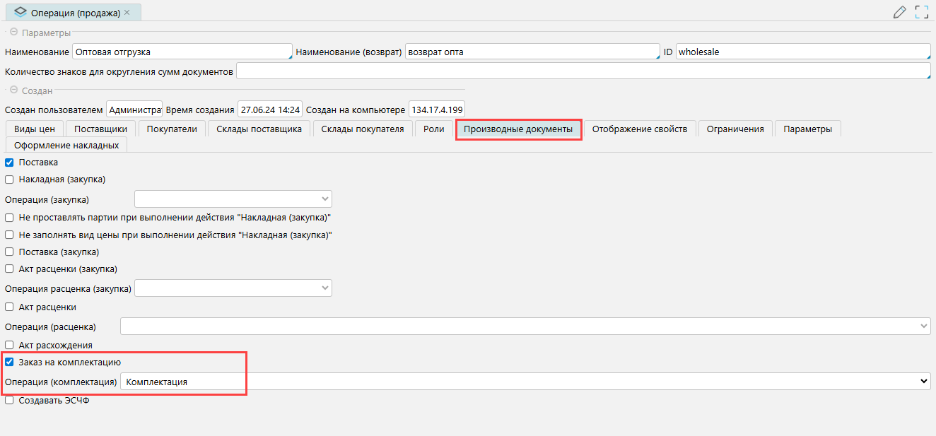 Заказ на комплектацию является производным документом заказа на продажу. Чтобы при создании заказа на продажу создавался и заказ на комплектацию, на вкладке Производные документы заказа на продажу должен быть отмечен флажком признак Создать заказ на комплектацию и в поле Операция (комплектация) должна быть указана операция комплектации. Признак будет отмечен автоматически, если установлены соответствующие настройки в операции продажи.
