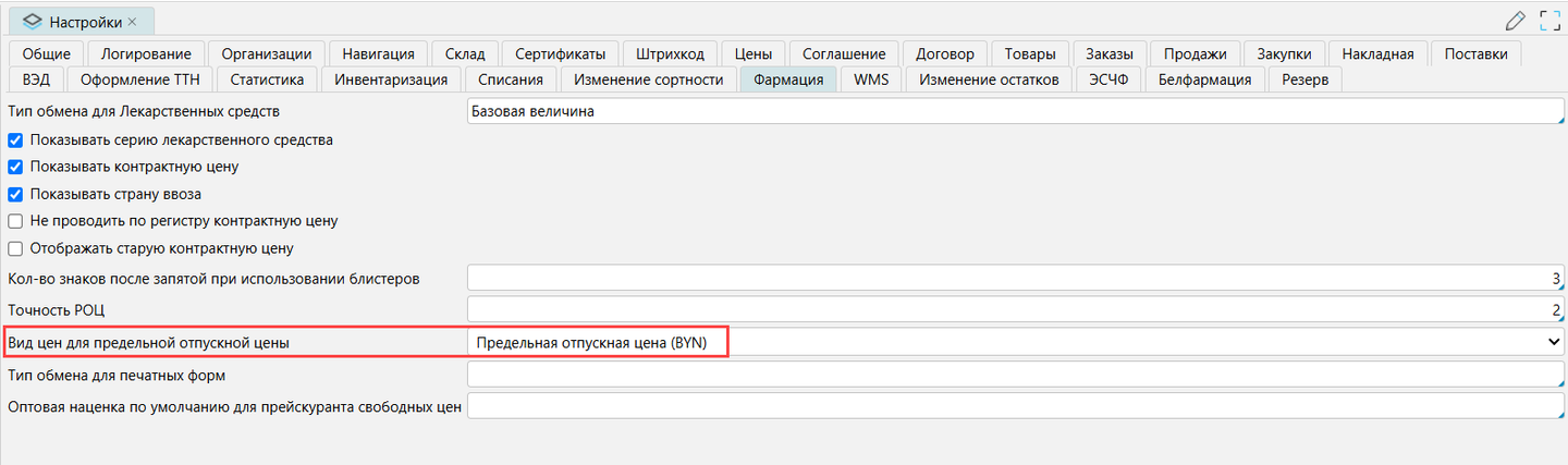Для контроля ограничения ПОЦ (в бел.руб.) в системе на форме Администрирование - Настройки - Фармация в поле Вид цен для предельной отпускной цены нужно установить вид цен для ПОЦ в белорусских рублях.