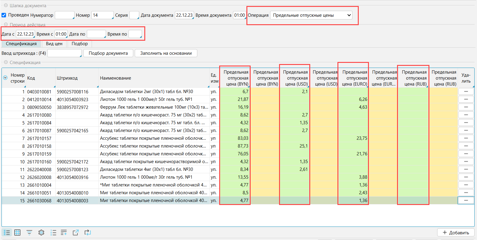 В новом прайсе нужно указать Операцию ПОЦ, Период действия и добавить товары, у которых определена ПОЦ, для них указать предельную отпускную цену в нужной валюте согласно соответствующему приказу МинЗдрава в полях зеленого цвета. В полях с жёлтой подсветкой отобразится ПОЦ, которая действовала до текущего прайса. Данные о ПОЦ можно найти на сайте Реестров УП «Центр экспертиз и испытаний в здравоохранении».