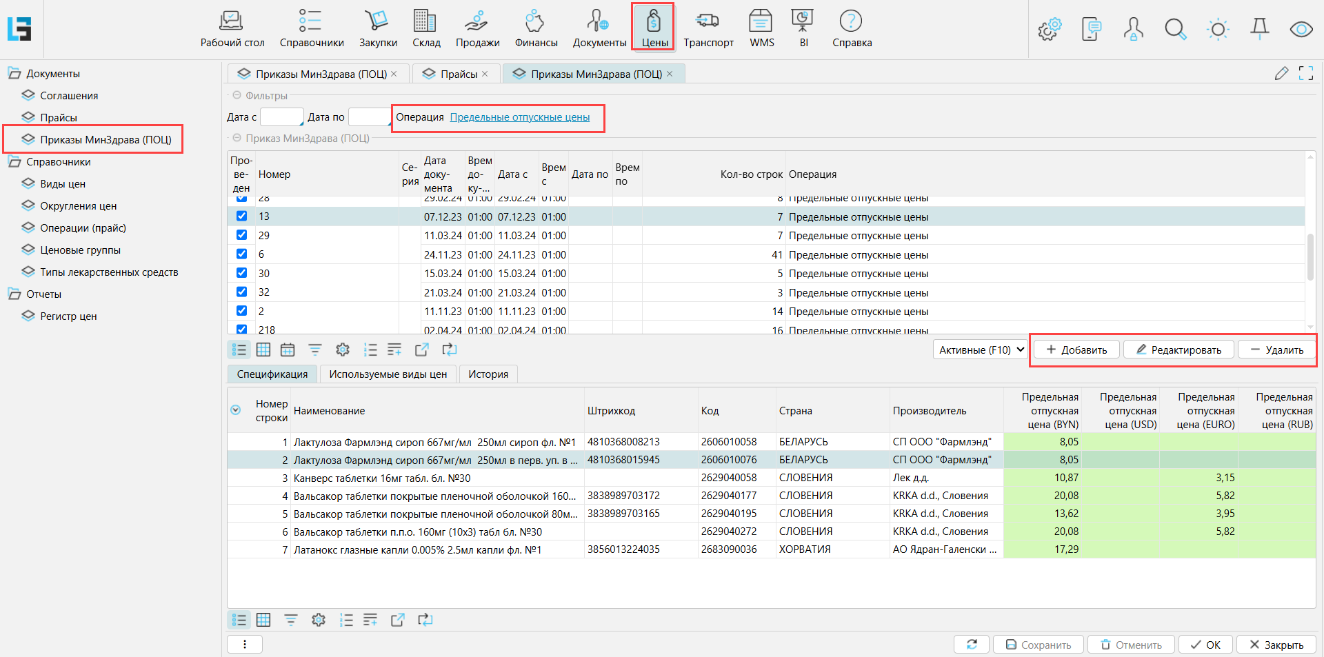 Прайсы с предельными отпускными ценами (по признаку Приказ МинЗдрава) отображаются на форме Цены -Приказы МинЗдрава. С помощью фильтра Операция можно отобрать прайсы только выбранной операции. Здесь же прайсы можно создавать и редактировать.