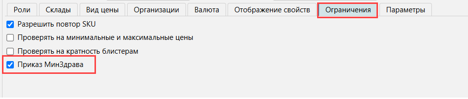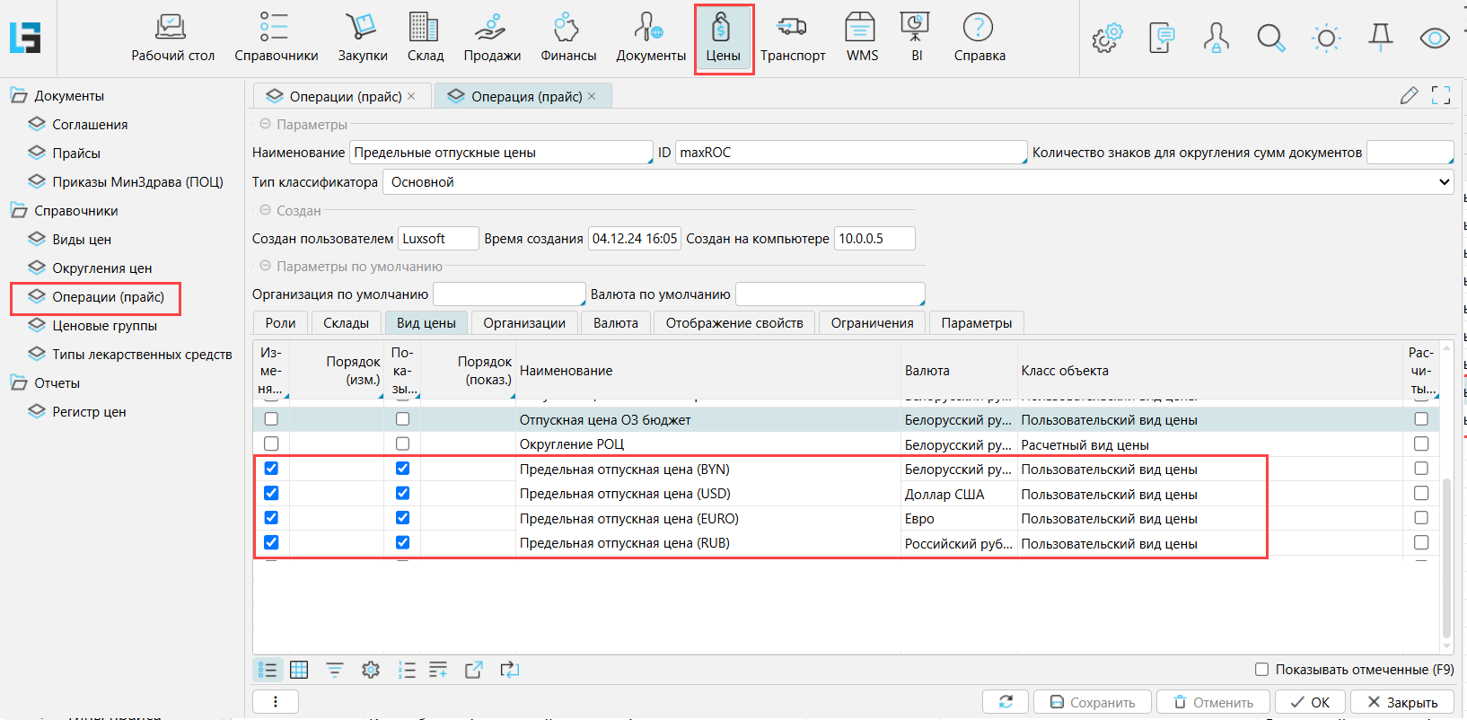 Далее на форме Цены - Операции (прайсы) создать операцию для ПОЦ. В операции на вкладке Виды цен отметить в колонках Изменять и Показывать тот(те) вид(ы) цен, заведенный для ПОЦ, который будет задаваться/изменяться текущей операцией. На вкладке Ограничения отметить признак Приказ МинЗдрава. В операции не нужно указывать Склады или Организации.