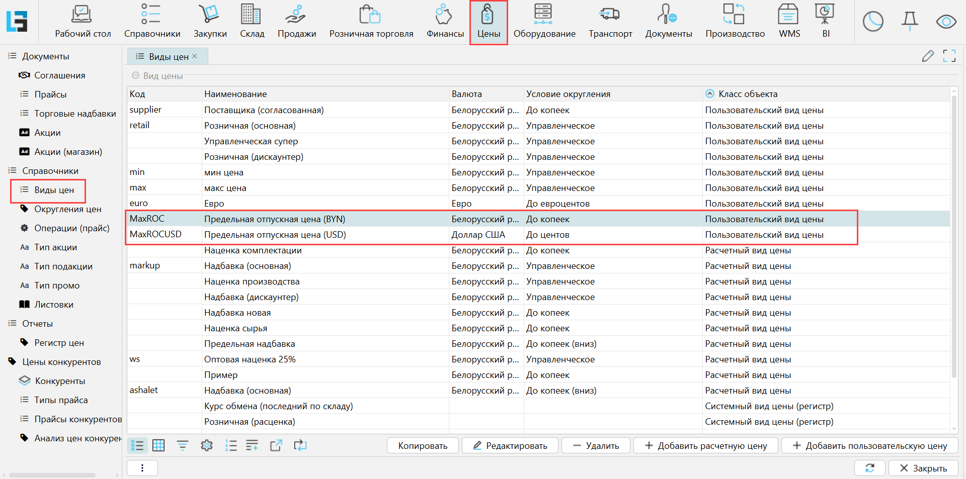 В системе Предельная отпускная цена (ПОЦ) вносится прайсом. Поэтому для ПОЦ нужно завести отдельный вид цены для каждой валюты. Для этого на форме Цены - Виды цен добавьте нужное количество пользовательских видов цен. Подробно о том, как это сделать, можно прочитать в статье.