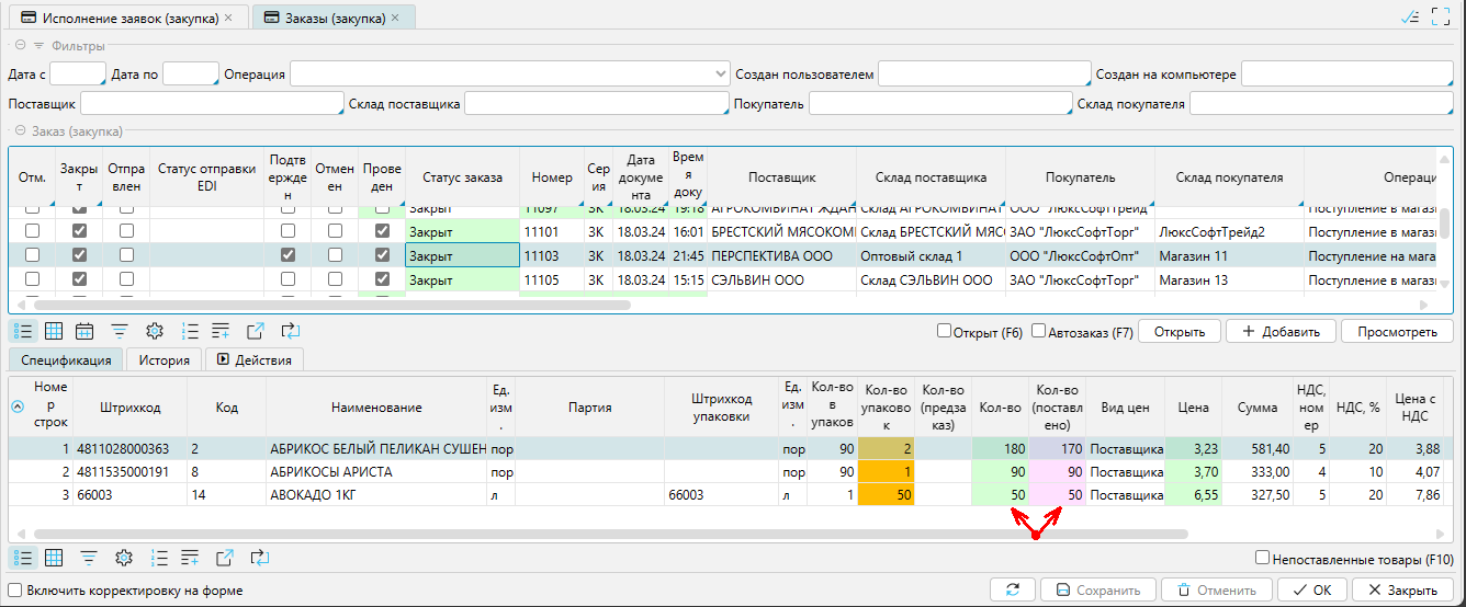 Контроль исполнения заказов поставщиком