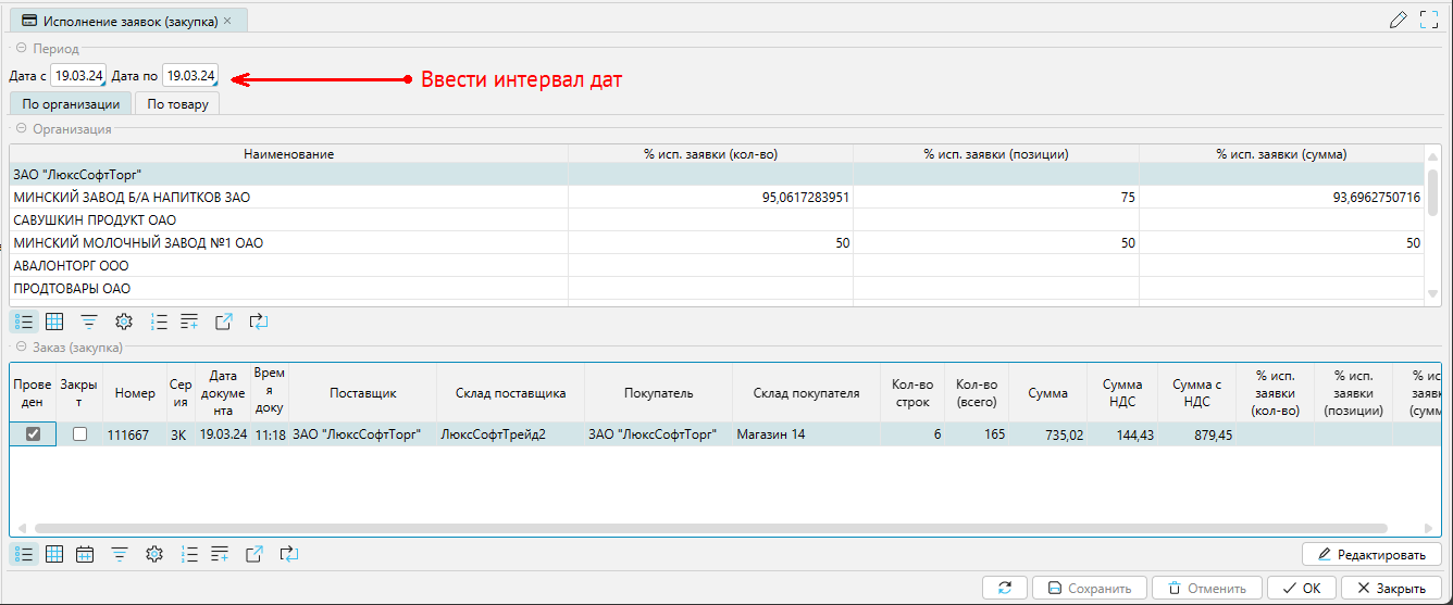 Указав интервал дат, получите данные в разрезе поставщиков на закладке По организации.