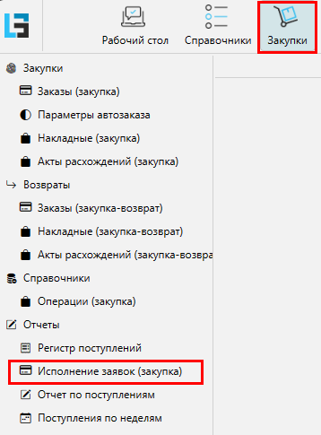 Информацию об исполнении заказов можно получить на форме Исполнение заявок (закупка)