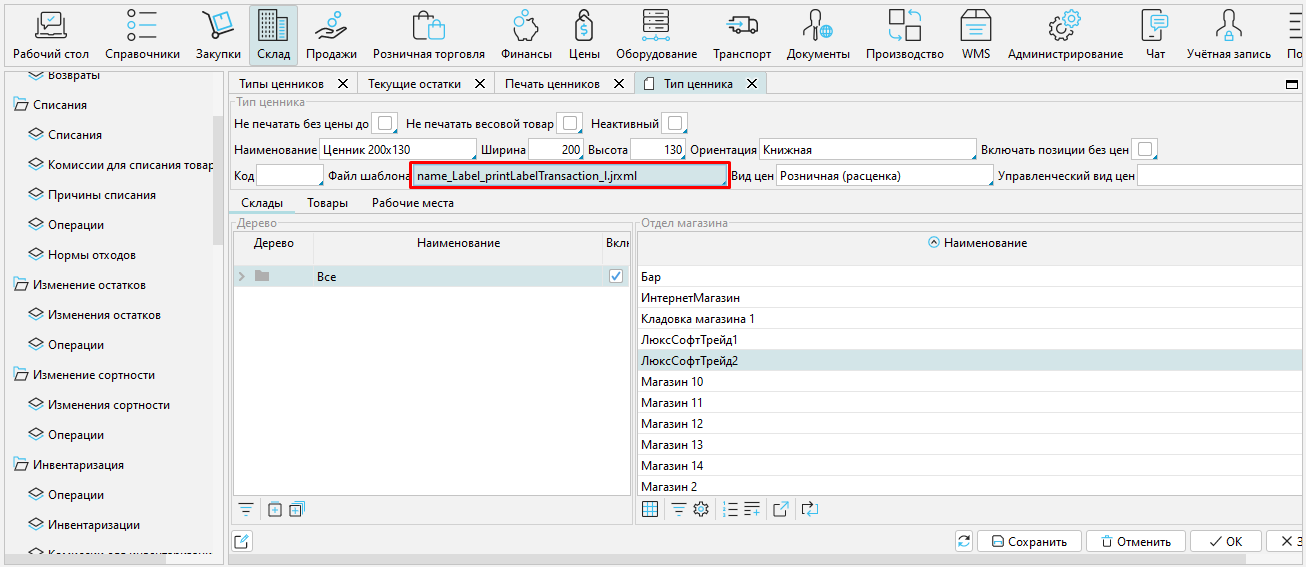 Для того, чтобы внести изменения в систему заменим действующий шаблон новым (форма Типы ценников).