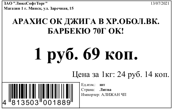 В рассматриваемом примере изменим размер и шрифт в названии товара, размер цены и цены за килограмм, уберем строку "Импортер", а также осуществим перенос наименования организации, адреса магазина и даты.