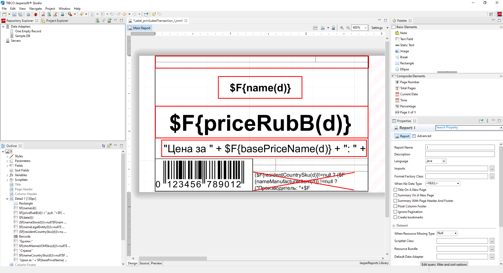 Рис. 5 Шаблон ценника в Jaspersoft Studio