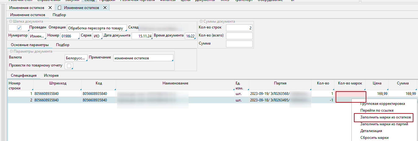 1. в документе где уже товар указан с обеими партиями - стать на колонку "Кол-во марок" , нажать правой клавишей мыши и в выпавшем меню выбрать пункт - "Заполнить марки из остатков". После этого марка будет указана в обеих строках товара.