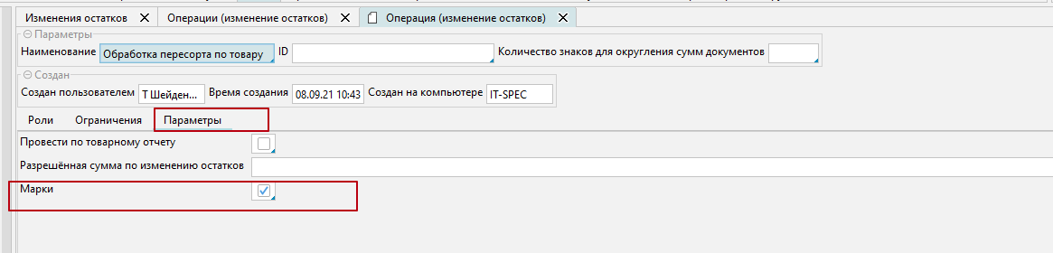 0) у операции изменения остатков, во вкладке "Параметры", нужно проставить признак "Марки"